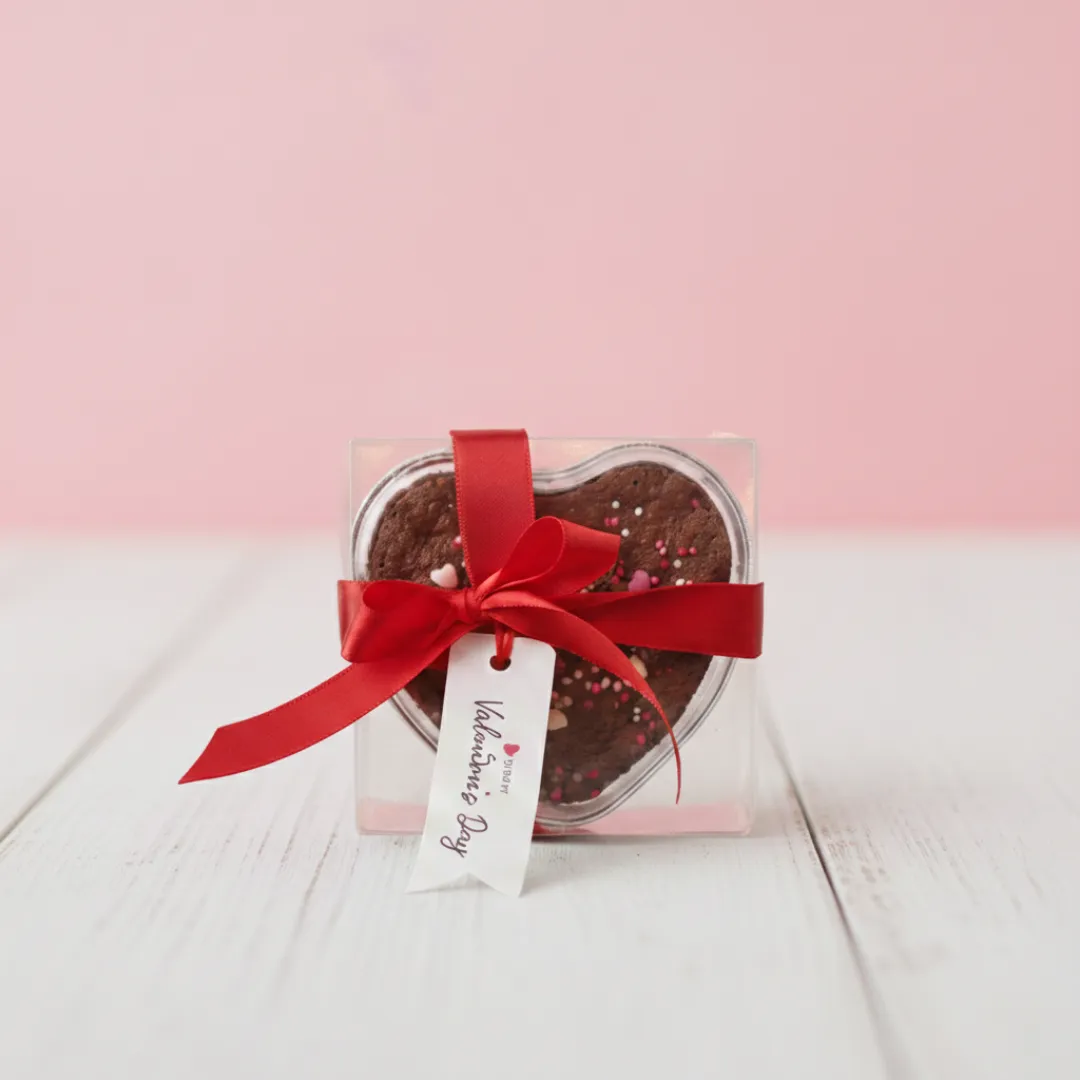 Delicioso brownie de chocolate con textura fudgy y centro húmedo en forma de corazón con sprinkles temáticos. Presentado en cajita clear envuelta con cinta roja y tarjeta temática.