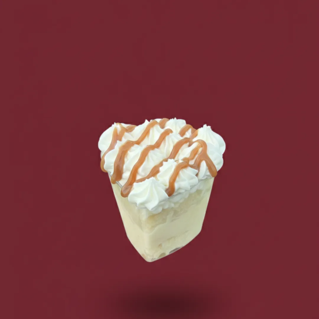 Tres leches de vainilla elaborado con nuestra mezcla balanceada de leches, servido en un vaso en forma de corazón y coronado con crema chantilly y un toque de dulce de leche.