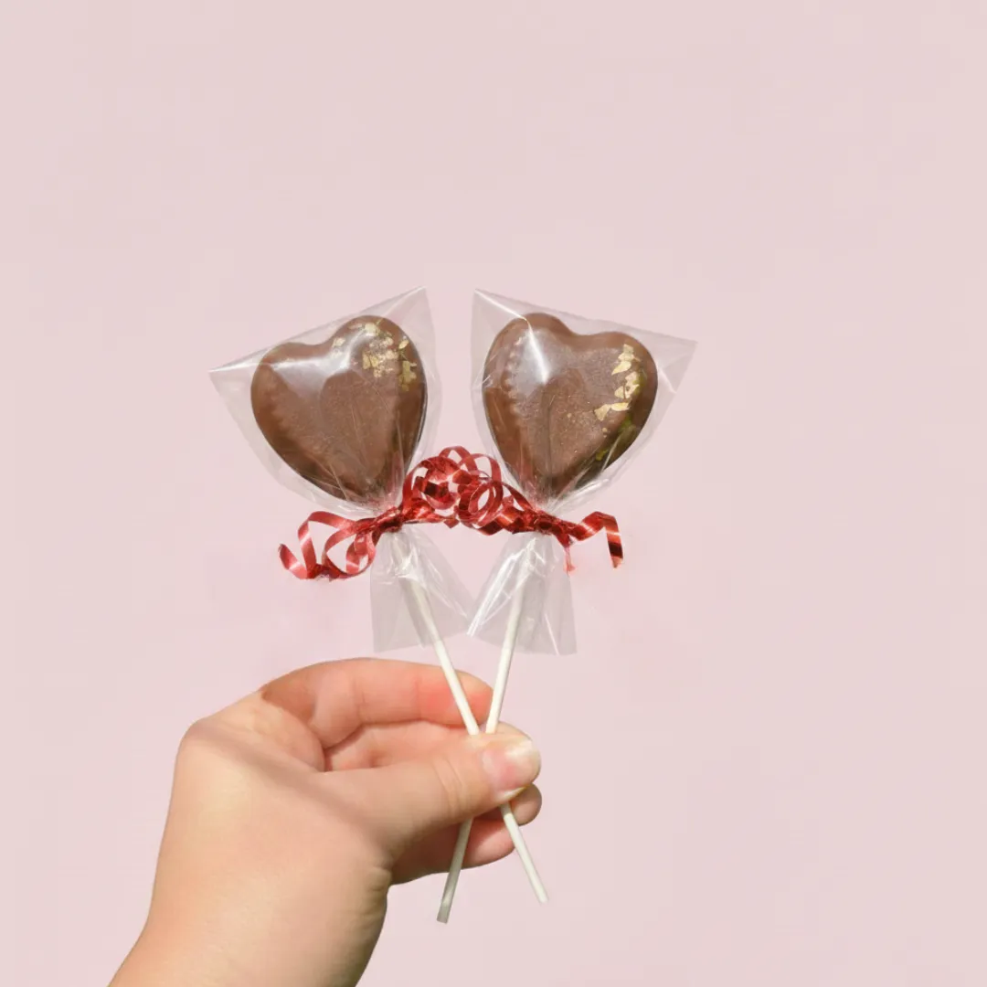 Paleta de milk chocolate en forma de corazón, decorada con detalles dorados. Detalle dulce y accesible para compartir con todo el equipo.
