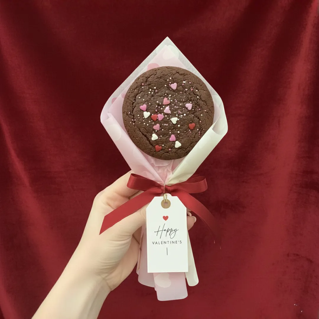 Galleta de brownie o chocolate chip decorada con motivo de San Valentín. Envuelta en papel decorativo con lazo y tarjeta "Happy Valentine's Day".